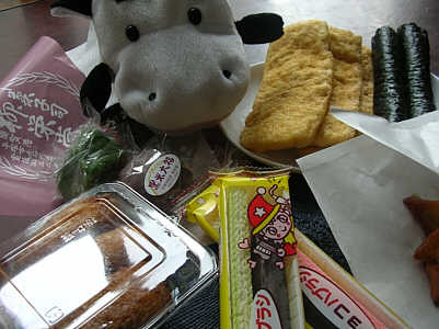 2月17日[ウシ君の日記] おいしい物探検隊隊長に任命されたneppaさん! ただの食いしんぼうだけなんだけどね・・ 今日は・・須賀に行ってきたよ・・・ 豆文への用事もあったけど・・ 小梅おばちゃんやお友達から教えてもらった 美味しいお店・・に行ってみた。 まず、お肉屋さんの「虎屋本店」・・ 焼き豚が美味しいんだって・・ でも少し早くて「今豚さん焼いてます」って言われた・・ 11時半に出来上がるんだって・・ 大学芋買った!(肉屋で芋かい?)美味そうだモン!