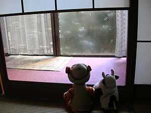 『暖かい部屋から見る雪景色はまた格別ですな!』