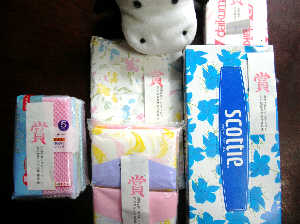 10月9日(日) 昨日は文化祭の絵の搬入だった・・疲れていた・・しかも、雨! 今日は休みたかった・・ でも申し込んでしまった地区レクのお弁当・・? 娘を連れ小学校へ・・ 体育館の中は色とりどりの自治会の旗が貼り付けられ、ものすごい人・人・・・ 競技が始まると・・・そこはがんばるお母さんたち!!もちろん私も・・ (どちらかと言うと子供の方が冷めていた?) <スポンジ・ティッシュ・石鹸・・・> それとお菓子! 賞品ゲット・・・! 雨の為短縮で行われたが午後・・車の12ヶ月点検予定が入り 最後の種目パン食い競争は出ずに帰った・・残念!