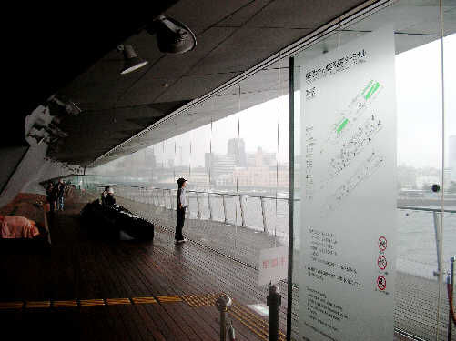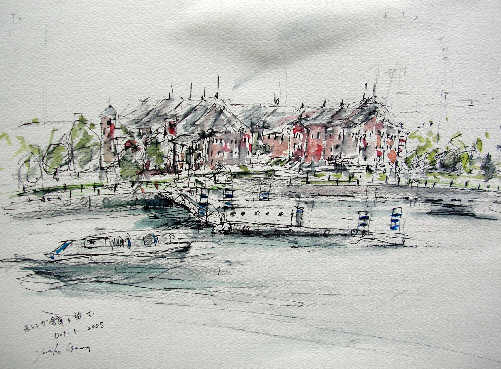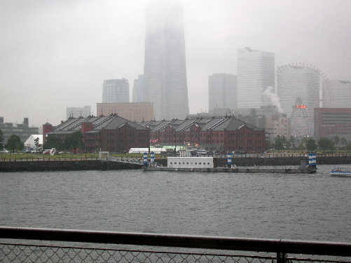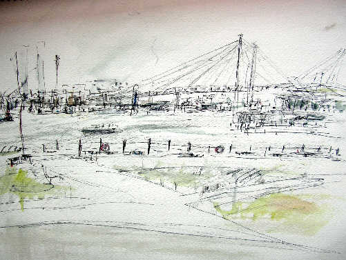 午後は赤レンガ倉庫へ・・まだ雨が降っている・・ 広い軒先で雨宿りしながらのスケッチとなった・・少し寒い! 目の前にMM21のビル群・・公園・・港・・ 先程の大さん橋国際ターミナル方面・ベイブリッジをスケッチ!