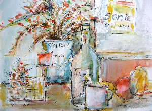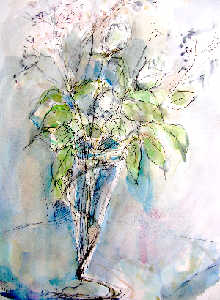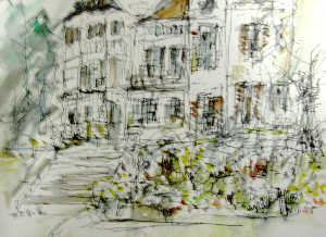 もう一つの会場は隣の大巧寺(だいぎょうじ)の参道を通り抜けたところにある・・ 参道の庭はムラサキシキブが紫のたくさんの小さな実をつけ見事! 水彩中心の小品・・・・ 心象風景・・もう水墨画の境地か? 素晴らしかった!