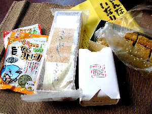 <今日の土産> ・豊島屋のきざはしと豆鳩落雁 ・半なり稲荷・・海苔巻にアゲが巻いてある<少し甘め ・目からうろこ/カリカリ煮干(チーズ味・明太子味)? |