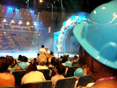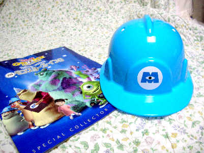 シマッタ!!京浜東北線に乗っちまった・・・ 新子安で慌てて降り、向かいの電車にのり、東神奈川に戻る・・横浜線だよ!新横浜は・・・疲れている>< この間”ゆず”のコンサートで来たばかりなのに〜お母さん!大丈夫?・・・ 新横浜駅に着くと・・おや?あの青いヘルメット・・・子供がかぶっているぅ〜うん!これこれ・・・ <モンスターズ・インク> 横浜アリーナに着くとヘルメットいくらですか?カタログに付いてます!2,500円 席はアリーナ!迫力!