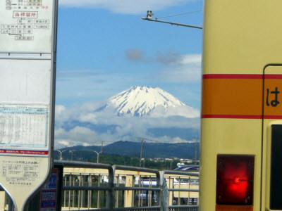 <片岡バス停とバスの間の富士>