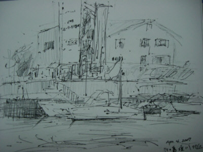 <港スケッチ>ペン・水彩・鉛筆