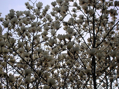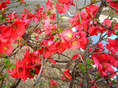 ハクモクレンの大木と鮮やかな色のボケの花が少し風に揺れていた。