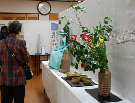 写真は会場の様子と作品の一部、喫茶コナーで談笑する見学者でお茶の先生による抹茶席もあります。 10時から16時までですので皆さんのお出でをお待ちしています。