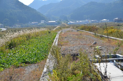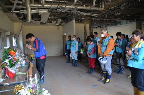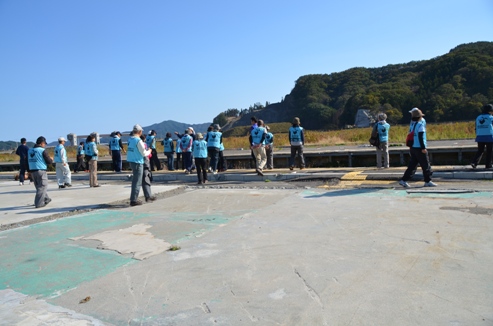 10月21日の作業・・・釜石市鵜住居地区個人宅(プレハブでお花屋を始められていた方の屋敷跡、庭)の草取りと瓦礫の撤去35名、現場は避難場所に指定され多くの人が無くなった防災センターのすぐそばで鵜住居駅もすぐ近くにありプラットホームの痕跡だけ残っていた。 1名は陸前高田市の思い出返し隊。