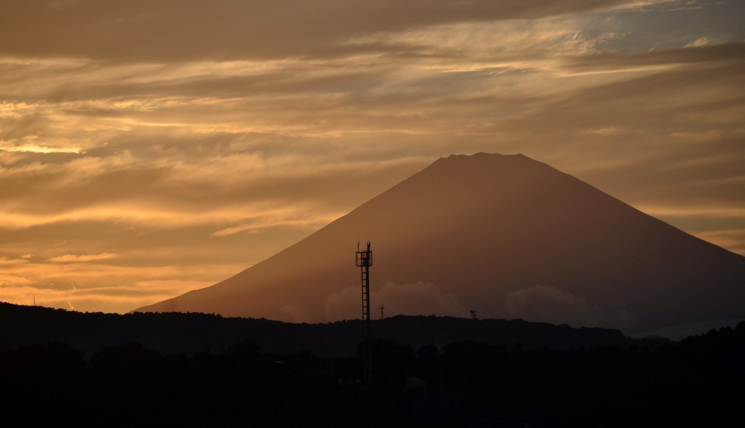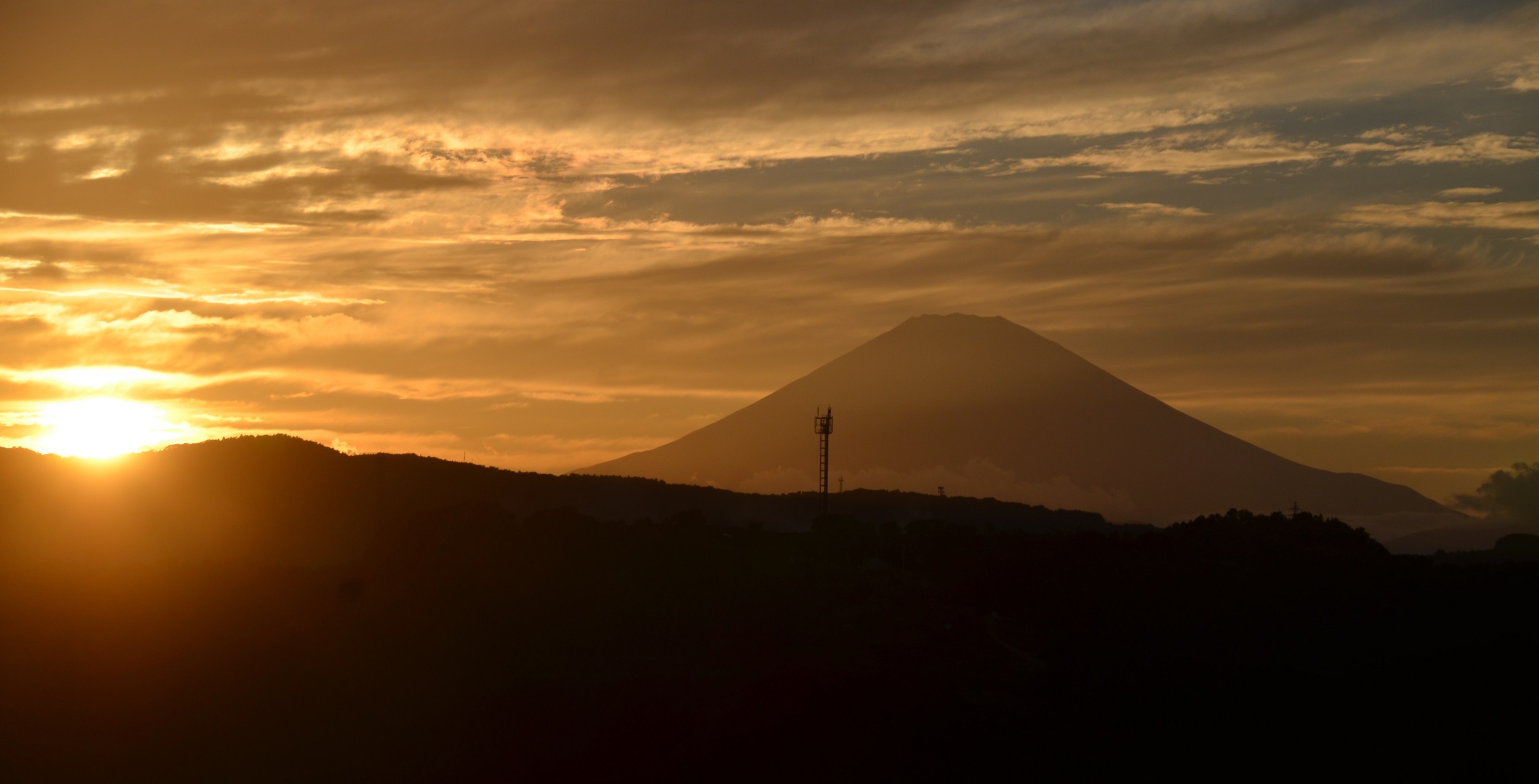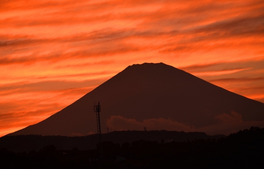 箱根連山に沈む夕日、緑が丘からの富士山 | ||
