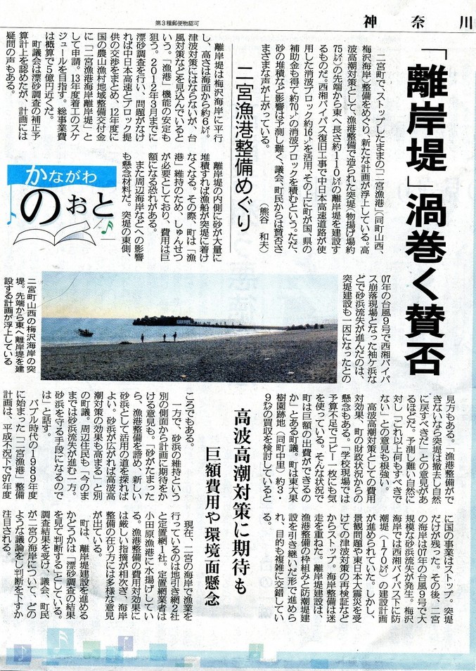 2008年9月の台風で二宮海岸の砂が殆ど流失、西湘バイパスの橋下駄に直接、波が当たる甚大な被害になりました。現在、西湘バイパスは復旧していますが梅沢海岸以外は(砂が戻らず)海に出られません。「波が西湘バイパス擁壁や工事用のテトラに当たりその震動や揺れがひどく怖くて眠れない。」「震動で家に亀裂が入った。テトラに当たるしぶきで塩害が酷くなった。」等、近くの住民は被害を受け続けています。