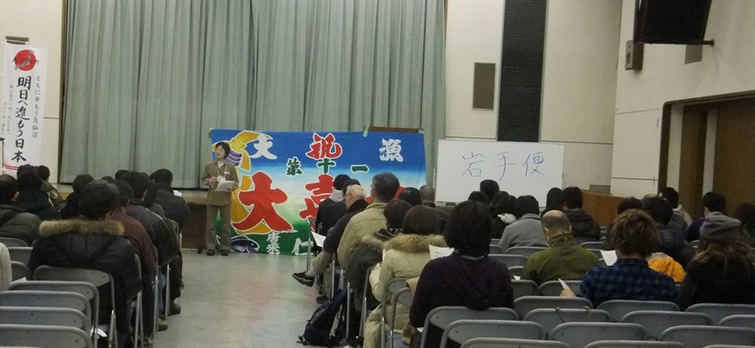 2月3日、「二宮海岸の海岸浸食と防潮堤の問題を考える集会」が下町児童館で開かれ 呼びかけ人の千葉さんや住民の方12名が集まった。