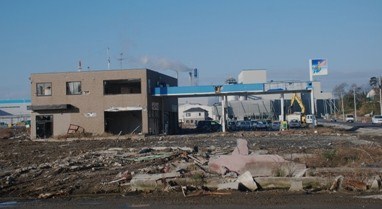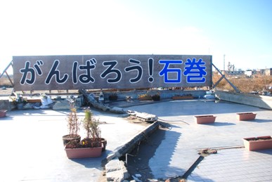 道の駅「上品の里」(4:17に到着8時出発)トイレ、コンビニ休憩、睡眠など時間調整をしました。石巻の朝は4℃と寒い。 11/26 8:51「がんばろう!石巻 」の看板の前で全員黙祷。前の道路は信号が出来、近くの工場の煙突から煙が出ていて少しは再会が進んでいるようでしたが延々と広がる津波のあとの風景は夏と変わっておらず瓦礫を片付けたあとの空き地が多くなって車も野積みされたままです。