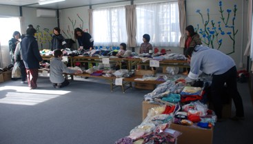 石巻ボラセン(湊小学校)で荷物の運搬作業の別動隊7人を降ろしてから専修大学に向かい倉庫からバザー用品を積み込み石巻開成11仮設住宅に入りました。 石巻開成11仮設住宅はかなり大きな団地で大きな集会室がありそこでバザー、ペーパークラフトをやりました。