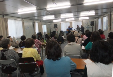 KSVN(神奈川ボランテイアネットワーク)の女性陣バザー組は手作りニット帽子、マフラーなど、仮設のお客さまに値切り交渉して貰ったり、試着して貰ったり楽しく会話しながら売り子をやっていました。ペーパ=クラフト組はお茶っこしながらクリスマスオーナメントやサンタさんやランタン作り仮設の人と作っていました。