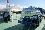 写真は(上から)講演会会場と防災フェアのテント村の給水車や展示されていた防護服(他に放射線量測定器なども)、特殊ハシゴ消防車。