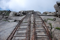 写真は上から@見上げる登山道の先に早池峰山、A小田越え9合目付近の梯子B頂上付近のお花畑C早池峰山頂には神社が祀られていました。