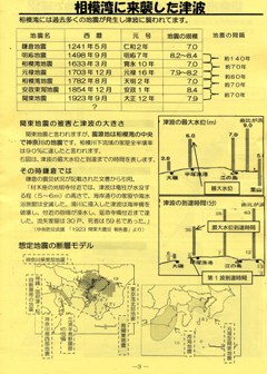 ミニ版(写真右)には相模湾に来襲した津波・地震の記録や予測が取り上げられています。鎌倉の関東大震災での震災状況は「材木座の光明寺付近では、津波は電柱が水没する程(5〜6m)の高さで、海岸通りの家屋や海水浴旅館は全滅した。滑川に侵入した津波は海岸橋を破壊し、付近の田畑が浸水し、延命寺橋付近まで達した。流失家屋は30戸、死者は59名であった。」(中央防災会議 「1923 関東大震災 報告書」より)とあり
