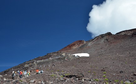 五合目レストハウス6:00着(朝食・トイレ等体調調整・徒歩は10分)→雲海荘(6合目7:00着)→後来光荘(新7合目7:13着・7:18発)→山口山荘(元祖7合目8:08着・18発)→池田館(8合目)→万年雪山荘(9合目9:40着・50発)→胸突山荘(9,5合目10:12着)・→富士山本宮頂上10時40分着