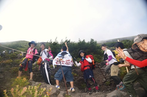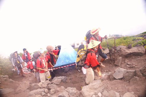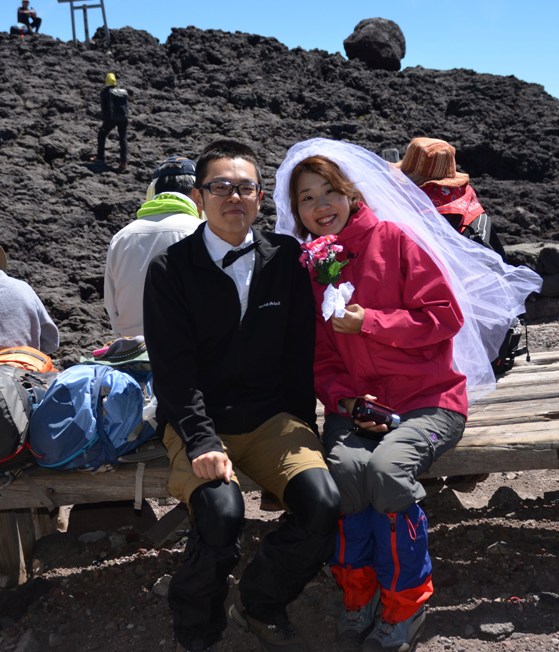 山頂で二人だけの結婚式をやっていたカップルに会った。下山途中では「冨士夢まつり」のお神輿の一行と100名を超える参加者の皆さんと会った。