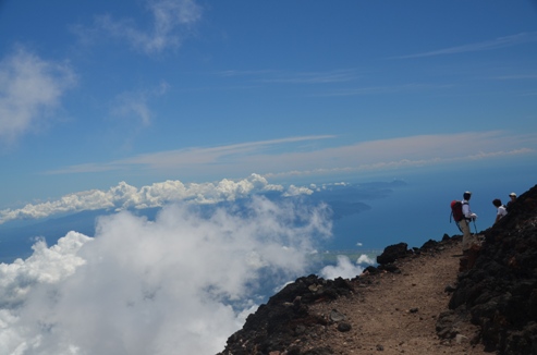 登る前に食事をとったり長めの休憩をとり高山病対策をして体を慣らしてから歩きはじめた。雲海荘からは自分のペースで歩け登りは高山病対策の時間調整を入れて4時間40分、下りが2時間10分かかった。富士山本宮頂上10時40分に着き、休憩後のお鉢周りは剣が峰で写真を撮ったり途中のお喋りが長かったせいか思ったより時間がかかってしまった。