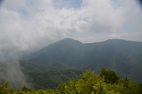 黒岳への登山道は明るい歩きやすい気持ちのいい登山道(写真下)です。三角点のある黒岳頂上に1時間で着きました。すぐそばの展望台からは富士山が見え隠れし雲が切れるのを待って写真を撮りましたが8時40分着は遅すぎでしたね。