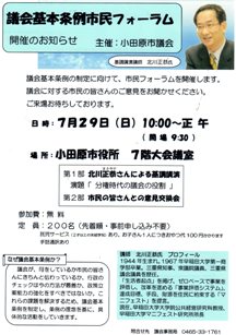 7月29日、小田原市議会で議会基本条例の制定に向け、素案作りの前に「市民の意見を聞こう。」と市民フォーラムが開催されました。