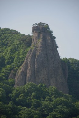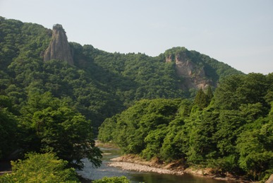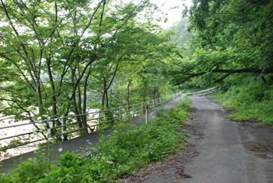 ここは旧県道で20年位前までバス通りだったが男神、女神の崩落の危険がありパイパスが出来、人が通らなくなった。真上にいつ崩れるか知れない男神岩・180m、女神岩・160m(直下の川 よりの高さ)がそそり立っている。