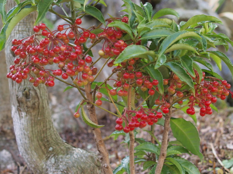 庭の万両の実が赤く色付きだしました。これより前に赤くなっていた千両はそろそろ鳥に狙われそうです