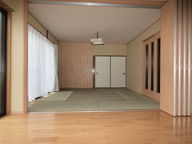 今までは襖で2部屋を仕切っていましたが6畳間をフローリングにしたので襖じゃ・・・ なので折りたたみ式の扉にしました。天井付近までの扉なので全開放だとかなり広く感じます。開け閉めも簡単で遊びに来ていた甥っ子でも楽に出来てました。