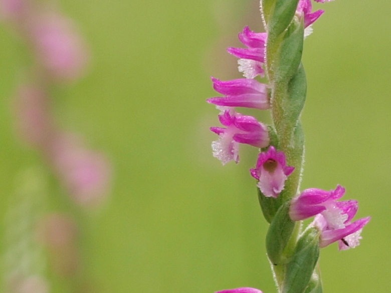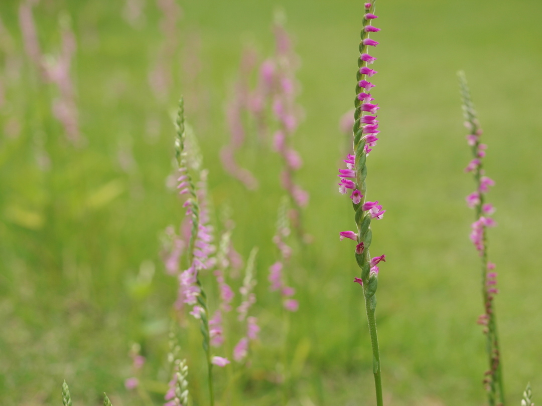 台風後にネジバナが沢山咲き出しました〜花部をトリミングするとネジレ具合が良く分かります。