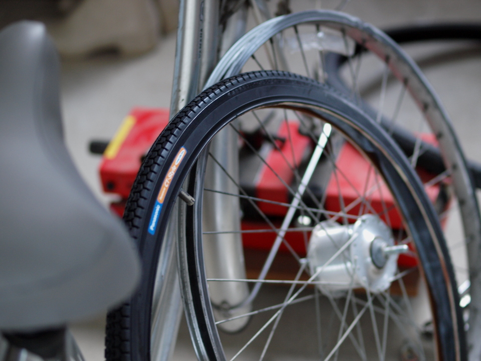 久しぶりの定時上がりだったのでサイドがヒビ割れていた母の自転車のタイヤを交換しますリアは以前交換したのでフロントだけです。