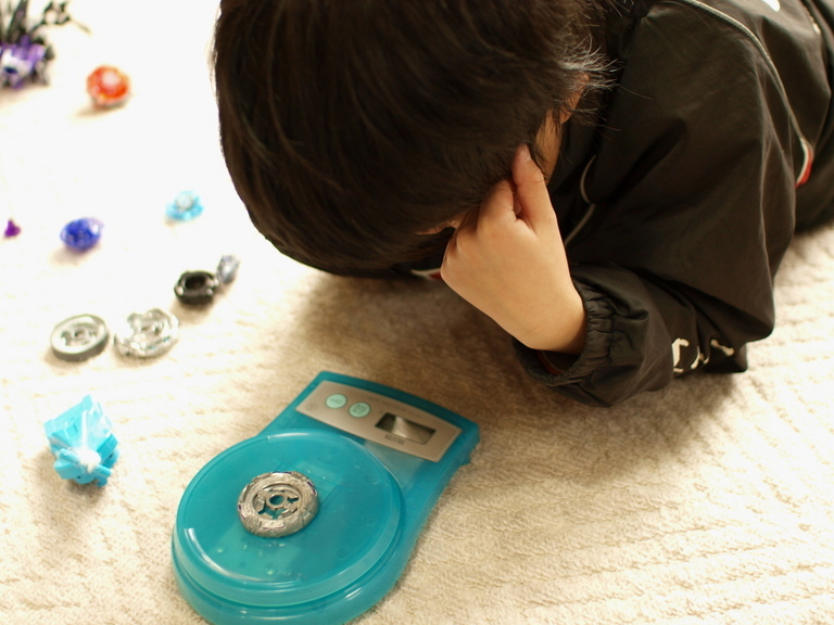 ビーダマンで遊ぶ弟と真剣にベイの重量を量る兄