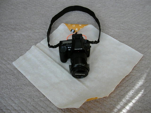 E−3用にシンプルなズームバッグが欲しかったのですがサイズ的に合う物が無くあったとしてもポケット等が沢山付いてイマイチで金額もそれなりに高い物に・・・風呂敷見たいな感じでカメラを包むタイプの物もありますが現物を見た事がないので購入するか迷っていました。それならば取り敢えず作ってしまえ!って事でダイソーでフェルト生地を買って家にあったドローコードを縫いつけて完成