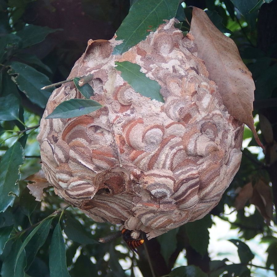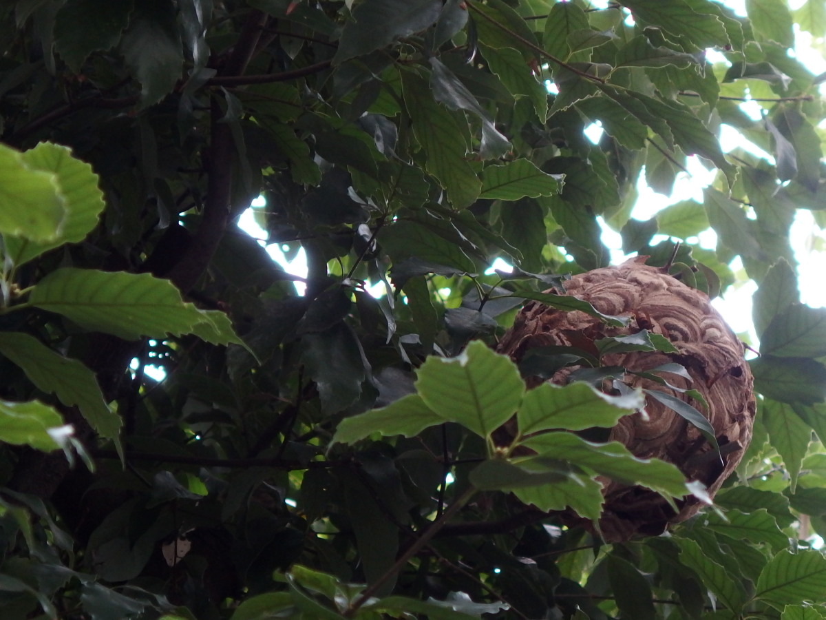 ちょっと木を揺らすと巣の中から沢山のスズメバチが出てきて