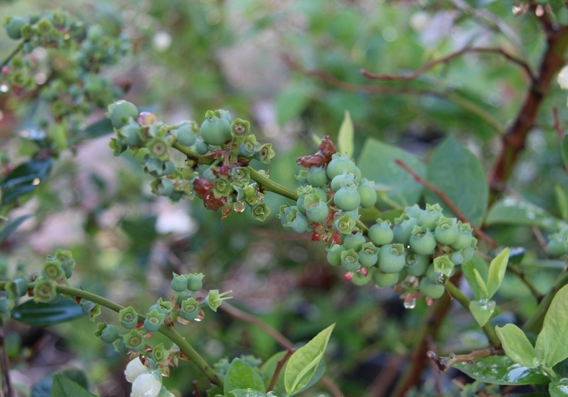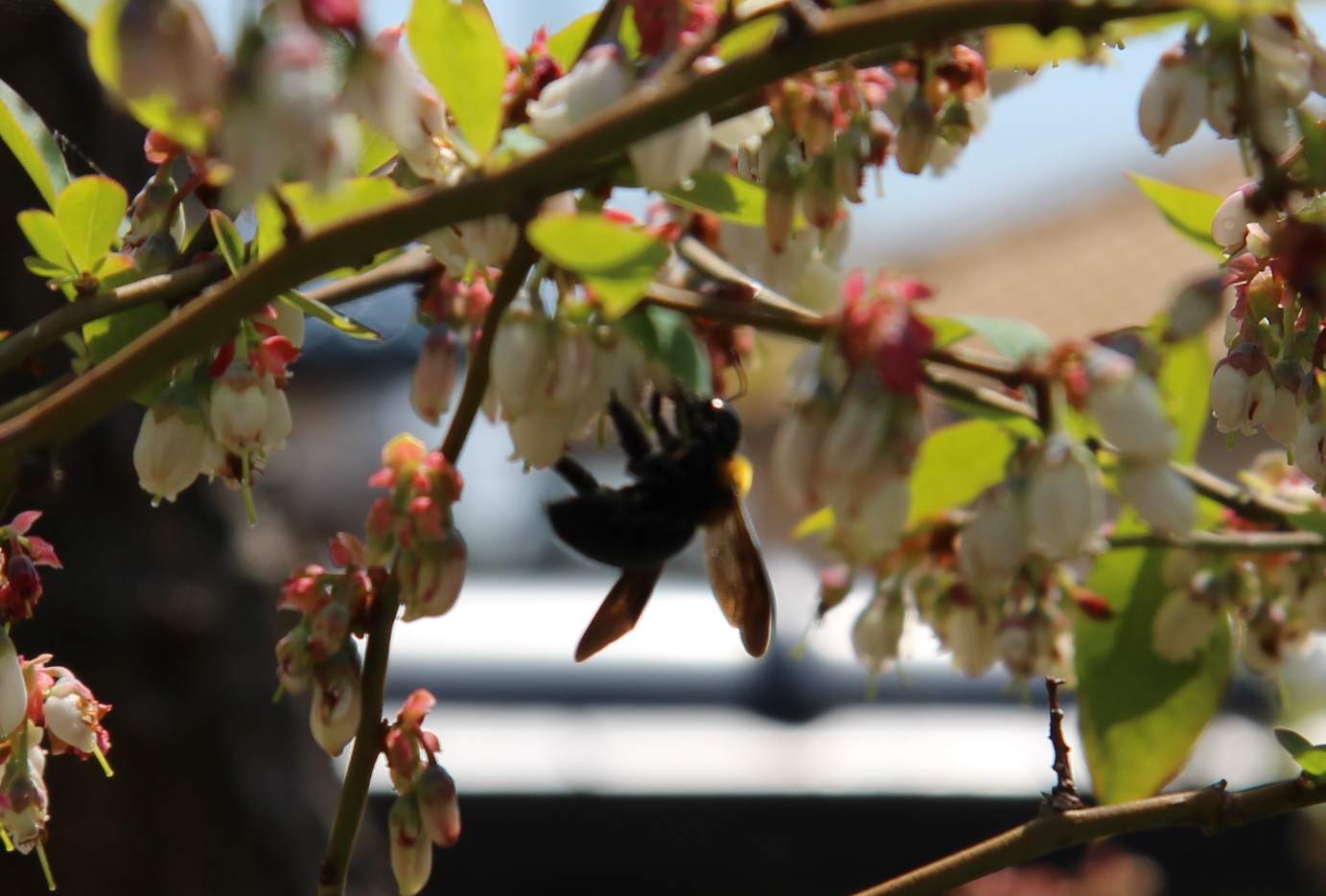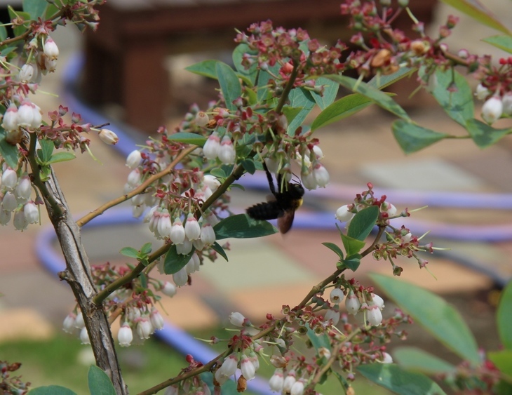 4月15日ころからマルハナバチらしき蜂4,5匹がブルーベリーの上を飛び回っています。すごい羽音です。クマンバチやクロマルハナバチとは違うようです。黒くて大きいのはクマンバチかと思っていましたが。マルハナバチは蜜蜂の仲間とのことです。無害で働き者なので梵天での受粉作業はやめました。 困ったことにアシナガバチもいますけど。