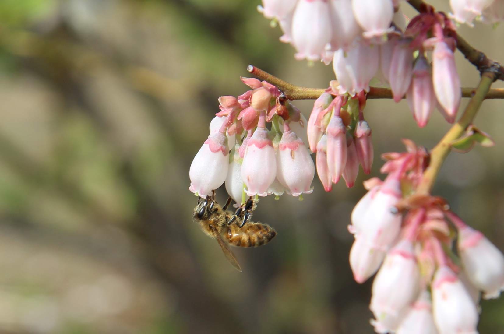 今日(4月21日)は蜜蜂もかなり増えました。ぶんぶんと羽音がブルーベリーの中から聞こえてきます。水やりをすると中から4,5匹の蜜蜂が飛び出てくることもありました。安心して受粉をお任せしようと思います。下の畑の土耕のブルーベリーにも10匹は見かけました。
