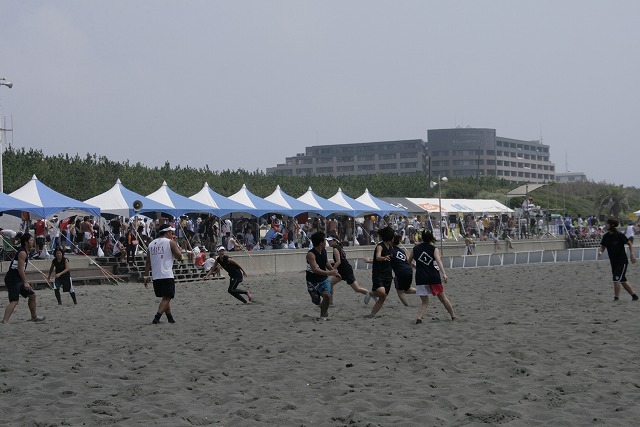 砂上の熱さにも負けずビーチラグビー、ビーチサッカーに興じる若者たち