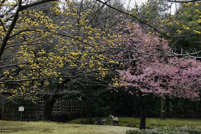 A満開のマンサクの花と河津さくら