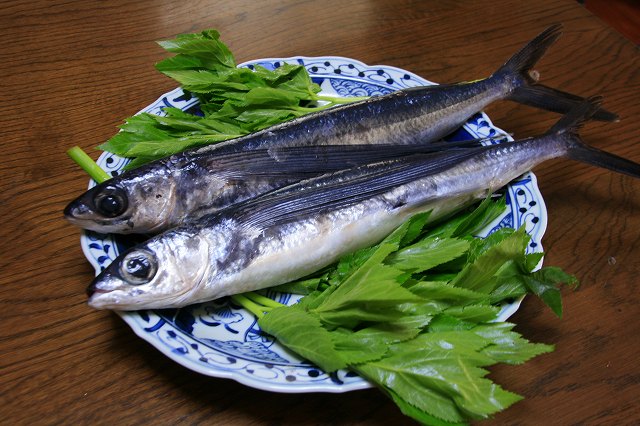 友人から40cmはくだらないりっぱな八丈島からの新鮮な飛び魚と明日葉をいただいた。