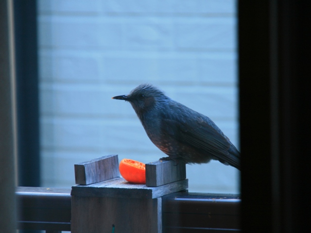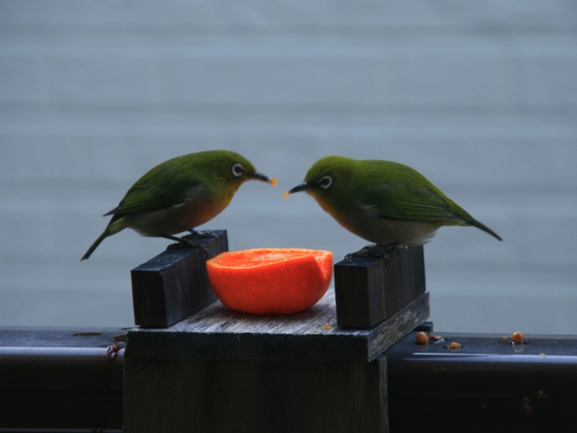 そこで餌台にみかんを置いてみるとたちまち啄み始める