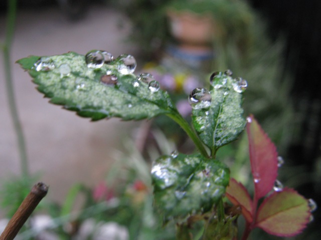 松葉、バラの葉、ブライダルベールにもかわいくしずくが光っている。