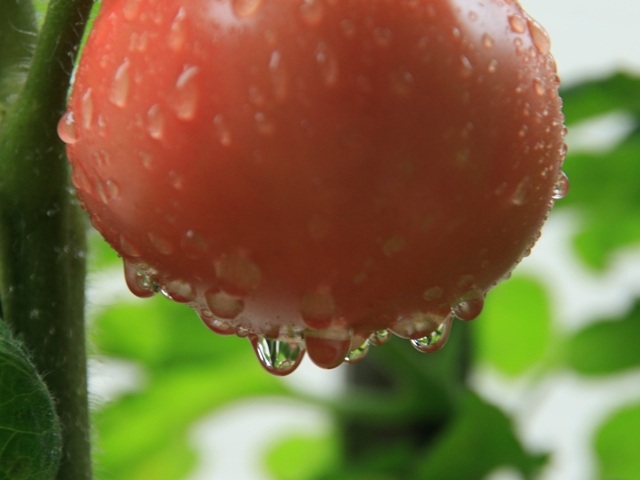今取れ頃のトマトにしずくがたくさん付いている。