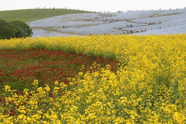 これがネモフィラの丘、上空は生憎の曇り空で空 海 丘のあおの三重奏は実現しなかったけれど、菜の花とのマッチングもすばらしかった、