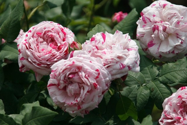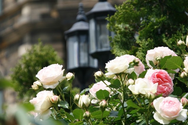 @A近くのサンライフホテルのローズガーデン、アンティックな教会を背景に色とりどりのバラが美しく咲き誇っていた。