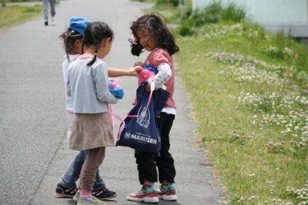 C土手を歩くかわいらしい女の子3人、微笑ましい姿に感動の一枚
