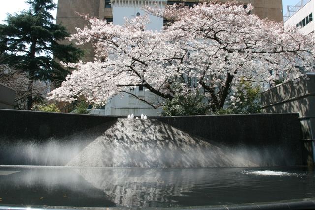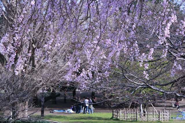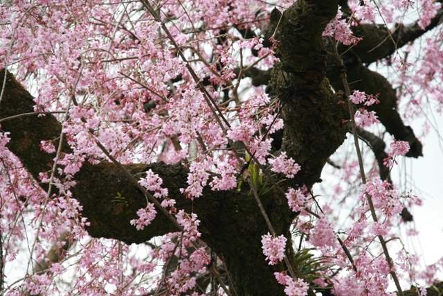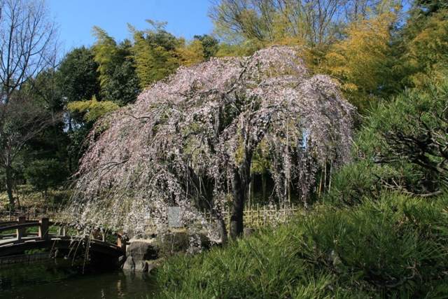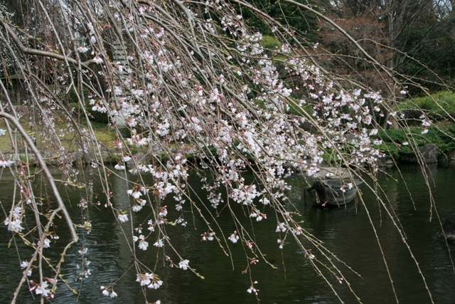 日本庭園の枝垂れサクラはまだ3部咲き、ちょっと寂しいかな