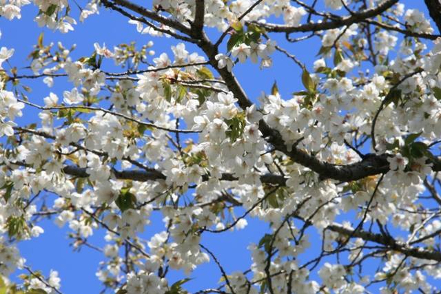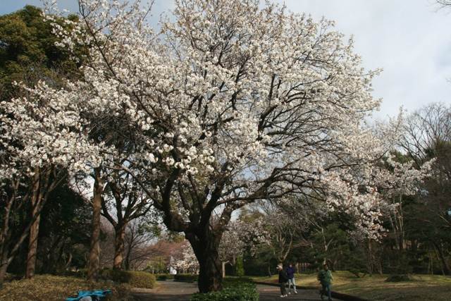 平塚球場南側に有る白い花びらをつけたオオシマサクラは満開