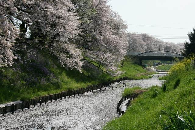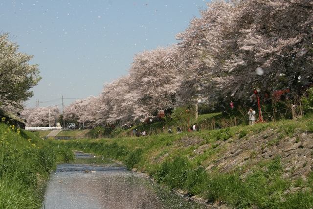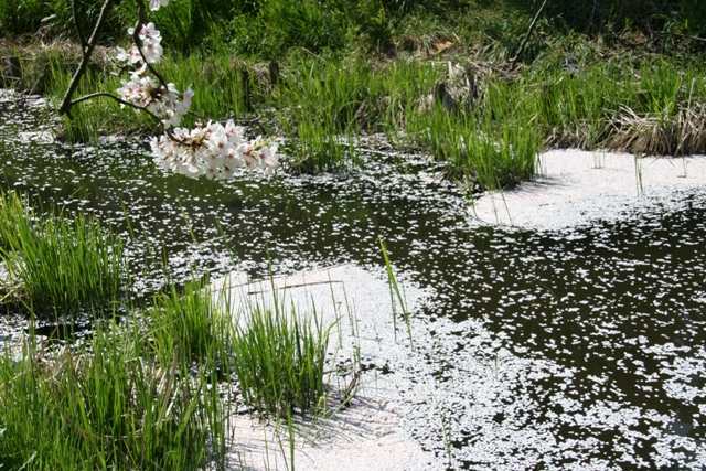 サーと吹く風に満開の木からこぼれる花びらが川をゆっくりとながれていった。