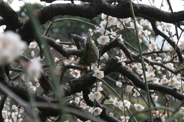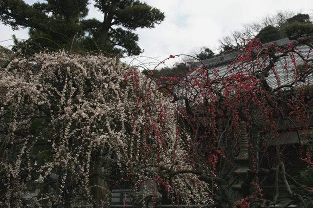 生憎の曇り空 江ノ島にある常立寺をたずねてみた きれいに整えられた紅白の枝垂れ梅が咲いている ここでもメジロが蜜をもとめてとんでいた