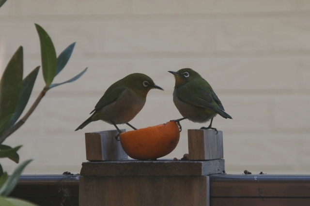 毎年ベランダに置かれたみかんに飛んでくるのは ムクドリ、メジロそれもそれぞれ一羽づつがみかんを啄んでいく 昨日は珍しく対でやってきてくれた 冬の暖かな日差しに和やかな気分を感じたひと時だった